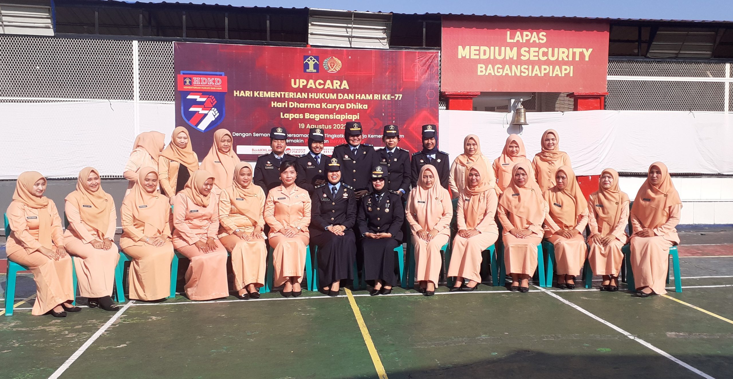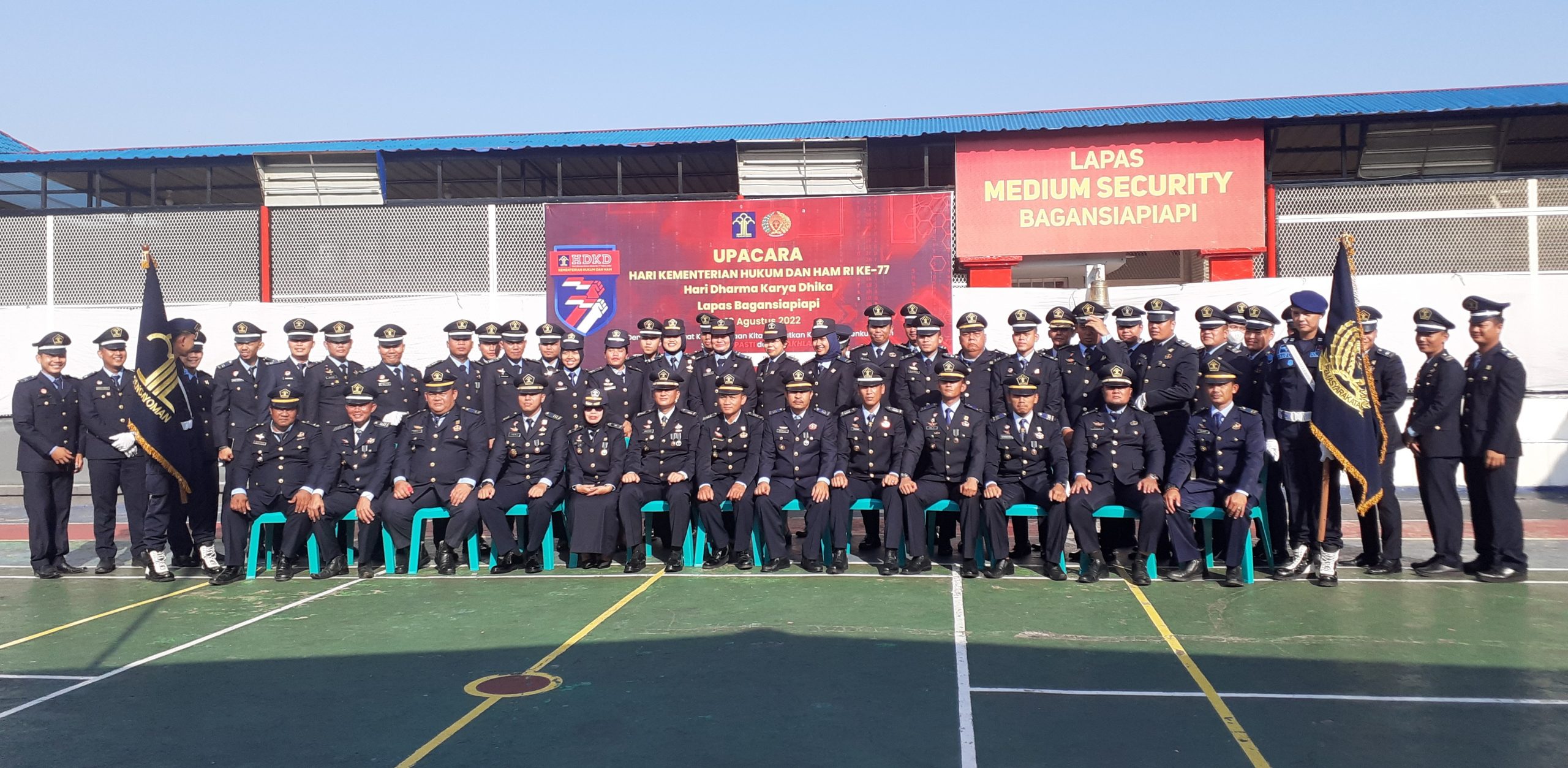 ROHIL – Lapas Kelas II A Bagansiapiapi gelar peringatan HDKD ke-77 Tahun 2022, yang dipusatkan di Lapas Bagansiapiapi dengan mengelar kegiatan upacara melibatka segenap pegawai di lingkungan Lapas, Jumat (19/8/2022). Peringatan HDKD dengan apel bersama dengan serangkaian prosesi seperti pembacaan pembukaan UUD 1945, pembacaan Panca Prasetya Korps Pegawai Republik Indonesia (RI), serta pembacaan teks Pancasila.