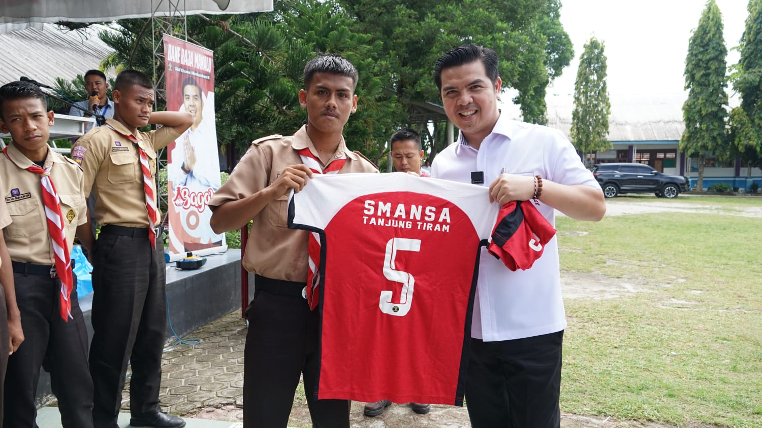 Usai memberikan motivasi, Bane Raja Manalu menyerahkan bola dan seragam futsal kepada pelajar SMA Negeri 1 Tanjung Tiram.