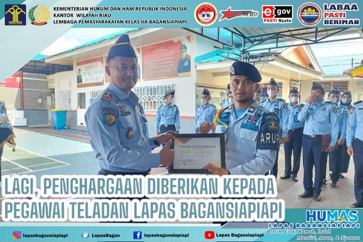 Kepala Lapas Kelas IIA Bagansiapiapi Wachid Wibowo secara langsung menyerahkan penghargaan kepada pegawai teladan Lapas Bagansiapiapi Triwulan I yang diberikan kepada Rudi Syahputra yang saat ini merupakan Komandan Jaga Regu IV.