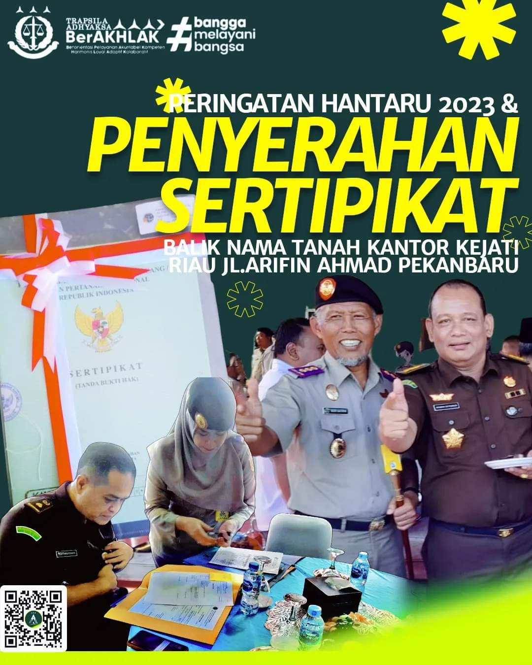 Kemudian diakhir kegiatan Hari Agraria dan Tata Ruang Nasional Tahun 2023, Asisten Pembinaan Kejaksaan Tinggi Riau Dr. Robinson Sitorus, S.H., MM., M.H berkesempatan menerima Penyerahan Sertifikat Tanah Kantor Kejaksaan Tinggi Riau yang beralamat di Jl. Arifin Ahmad Kota Pekanbaru sebagai hasil eksekusi aset hasil Tindak Pidana Pencucian Uang dalam Tindak Pidana Korupsi beberapa tahun lalu yang saat ini telah sah menjadi milik negara Cq. Kejaksaan Tinggi Riau. Kedepan dengan pemilikan tanah tersebut akan dimanfaatkan sebesar-besarnya untuk kepentingan Pemerintah dibawah penguasaan Kejaksaan Tinggi Riau,”ungkapnya.