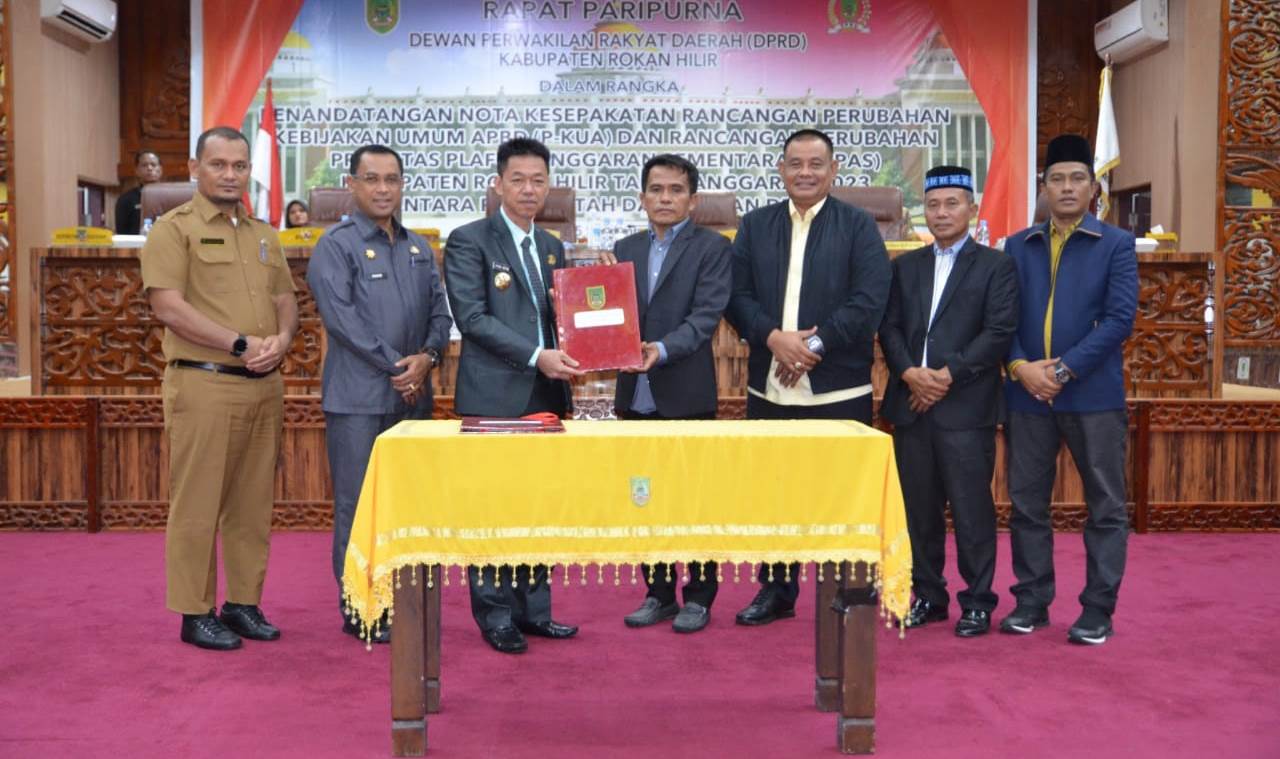 ROHIL – DPRD Kabupaten Rohil menggelar paripurna dalam rangka penandatangan Kebijakan Umum APBD Rancangan Perubahan Prioritas Plafon Anggaran Sementara (P-PPAS) Kabupaten Rohil 2023.