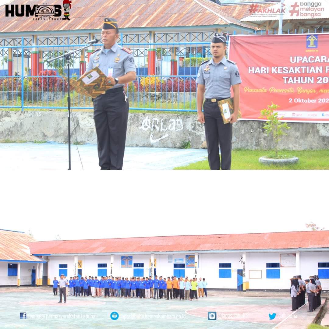 LABUHAN| Seluruh Jajaran Lembaga Pemasyarakatan (Lapas) Kelas III Labuha melaksanakan Upacara dalam rangka Memperingati Hari Kesaktian Pancasila Tahun 2023, Upacara dilaksanakan di lapangan Lapas Labuha dan diikuti oleh Pegawai Lapas Labuha dan Warga Binaan Pemasyarakatan (WBP) Lapas Labuha. Minggu (1/10/2023)