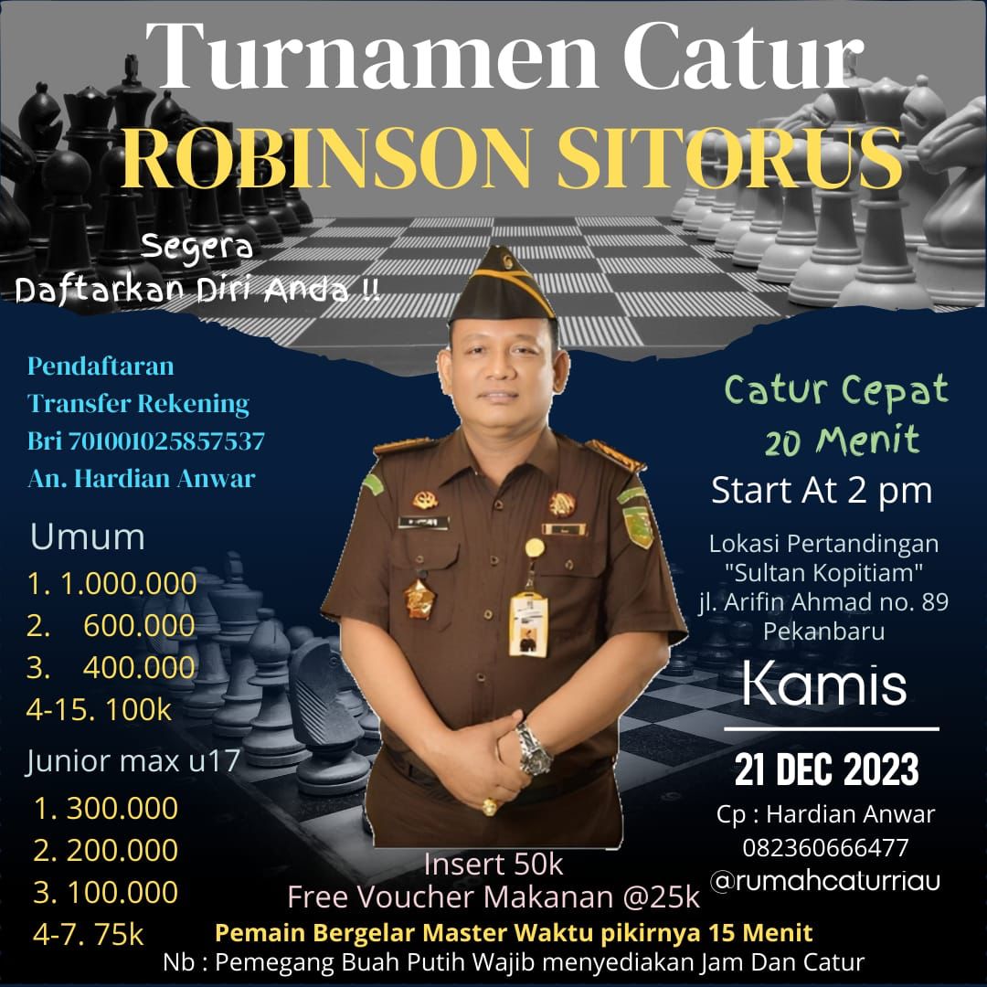 Turnamen Catur Robinson Sitorus terbuka untuk umum dan akan dilaksanakan pada hari Kamis tanggal 21 Desember 2023