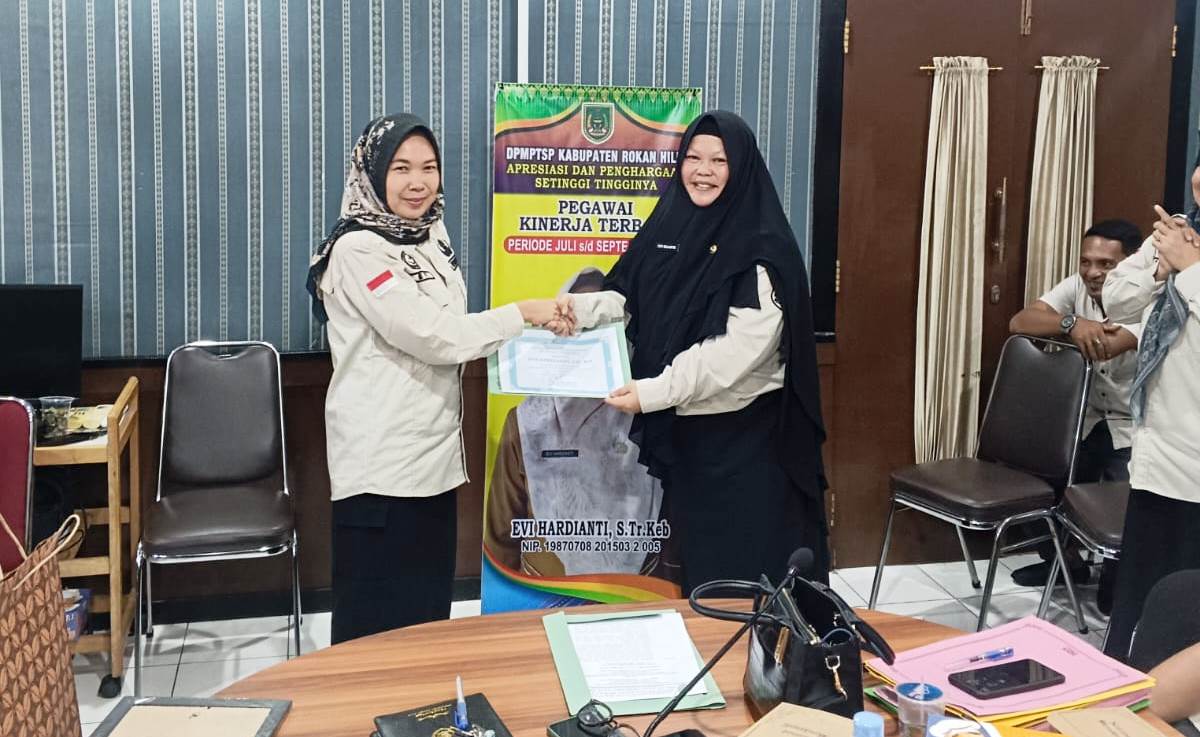 ROHIL – Dinas Penanaman Modal dan Pelayanan Terpadu Satu Pintu (DPMPTSP) Rokan Hilir memberikan apresiasi atas penilaian kinerja triwulan III (periode Juli-September) bagi jajaran pegawai di lingkungan kantor tersebut.