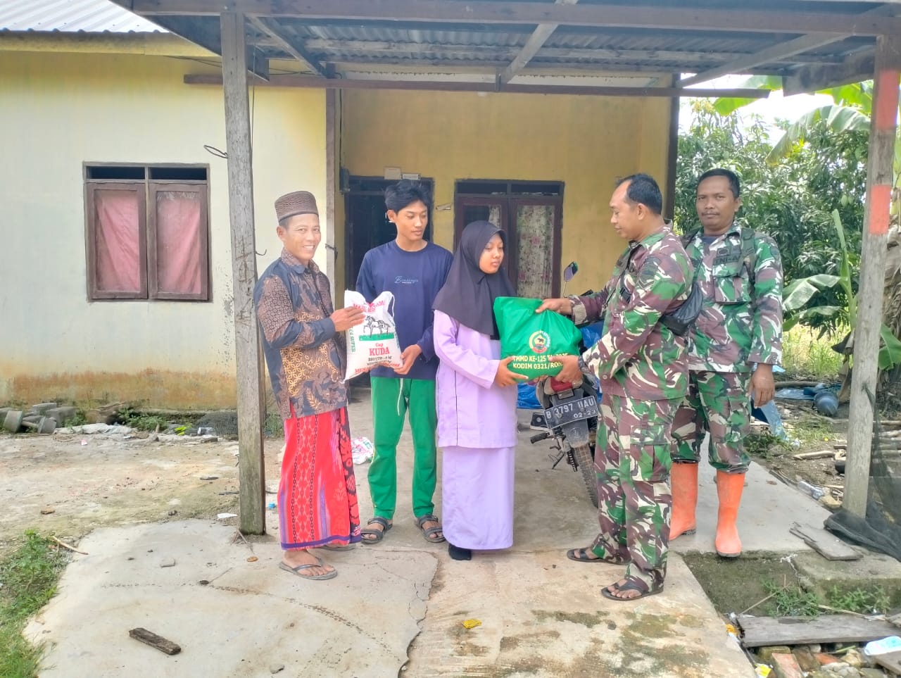 Usai Sholat Jumat, Satgas TMMD melanjutkan kegiatan Jumat Berkah dengan membagikan paket sembako kepada 10 warga yang terdiri dari lansia, anak yatim, dan warga kurang mampu di Kepenghuluan Rokan Baru Pesisir.