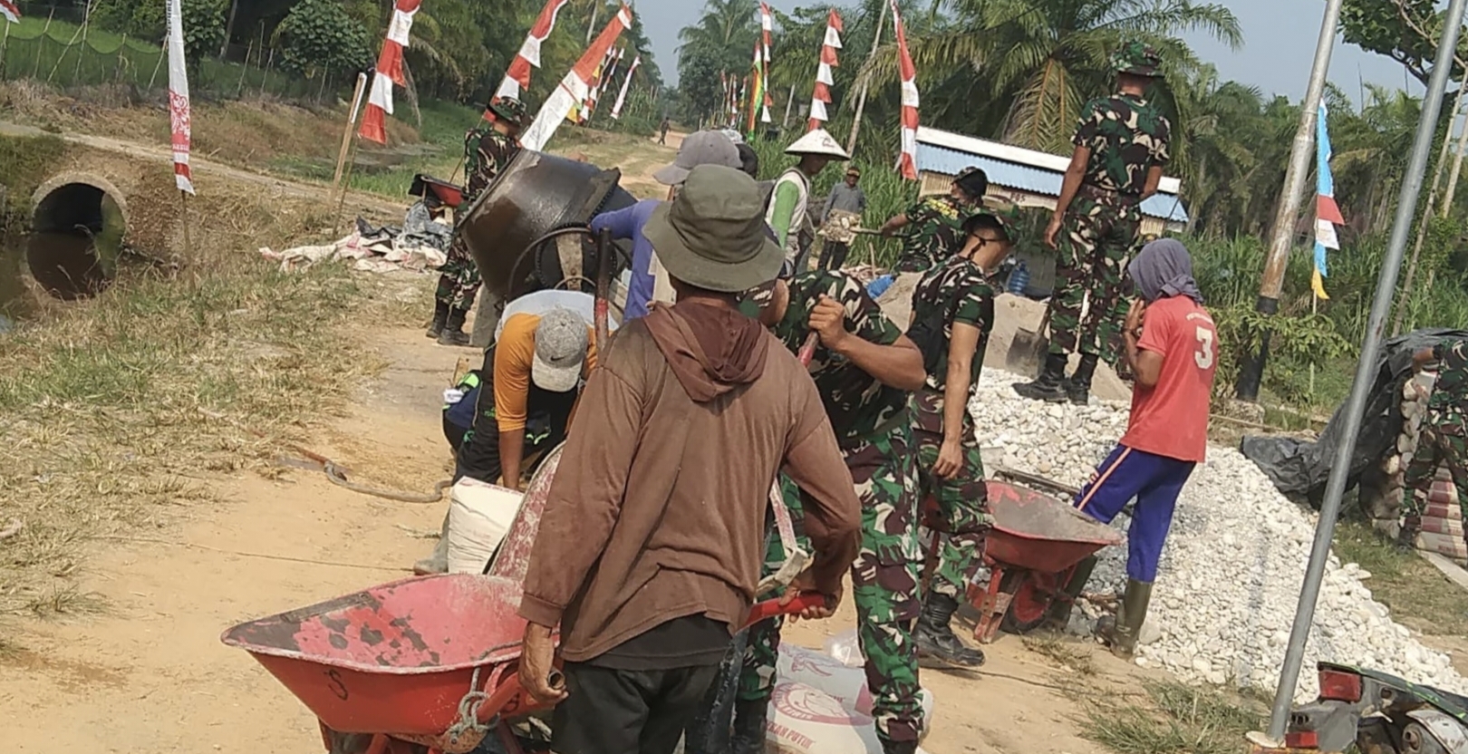 Suasana di lokasi proyek dipenuhi semangat gotong royong. Prajurit TNI dengan seragam lapangan dan warga dengan pakaian sederhana bekerja bahu-membahu, saling membantu mengangkut material dan meratakan adonan semen. Tawa dan obrolan ringan sesekali terdengar, menciptakan suasana yang penuh keakraban. Kehadiran warga yang secara sukarela ikut bekerja, termasuk tokoh masyarakat setempat, menjadi bukti nyata antusiasme menyambut program TMMD ini.